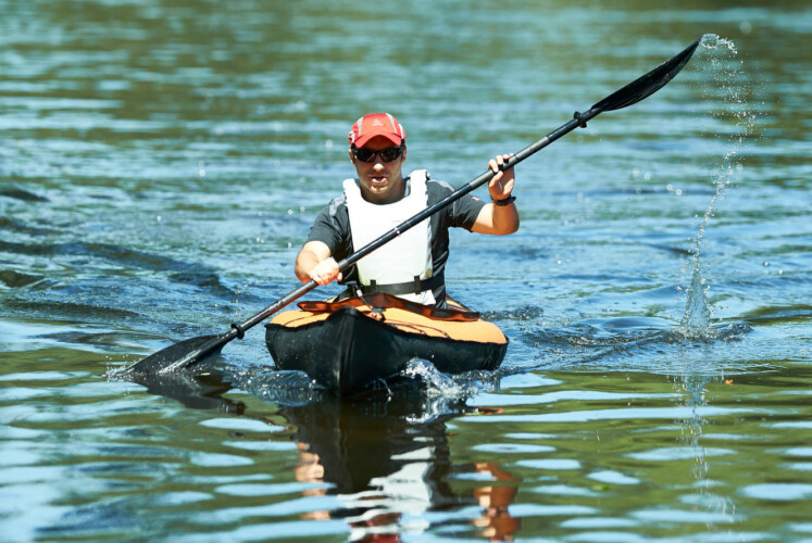 Fahreigenschaften: Auf dem Weg zum Einstieg wird ein weiterer Vorteil des Scubi deutlich. Mit nur neun Kilogramm ist es extrem leicht im Vergleich zu anderen Kajaks. Ein Bootswagen oder ähnliches ist nicht nötig. Man trägt es einfach auf einer Schulter. Der Einstieg gelingt kinderleicht, was ein erster Beweis für die Kippstabilität dieses „Hybrid-Bootes“ ist. Nichts ist ärgerlicher, als bereits vor Beginn der Tour unfreiwillig im Wasser zu landen. Mit dem Scubi ist das nur schwer möglich. Dann folgen die ersten Paddelschläge und es zeigt sich, dass das Kajak trotz seiner Kürze sehr gut die Spur hält. Das liegt unter anderem am vorgeformten Kiel. Wer nun denkt, zumindest bei der Geschwindigkeit müsste man Abstriche machen, der täuscht sich. Klar ist das Scubi nicht so schnell wie Touren- oder Sportkajaks, aber mit den meisten Verleihmodellen kann es sicherlich mithalten. Das zeigen die ersten schnelleren Paddelschläge deutlich. Auch der Eindruck vom Einstieg verfestigt sich immer mehr: Das Scubi bringt so leicht nichts zum Kentern. Das ist insbesondere für Sportler von Vorteil, die keine große Kajak-Erfahrung haben, wie zum Beispiel auch die meisten Skilangläufer. Aufpassen muss man lediglich bei Niedrigwasser oder Untiefen. Für heftigen Bodenkontakt sind Falt- und Luftboote nämlich nicht geeignet.