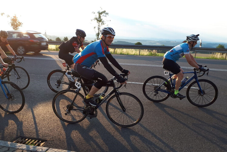 Am 29. Juni 2018 um 5:30 Uhr war dann endlich Start. Die letzte Woche hat sich mangels Radtraining (Ruhe vor dem Sturm) und dem vielen Essen ganz schön in die Länge gezogen. Außerdem horcht man ständig in seinen Körper hinein, ob vielleicht doch noch ein Wehwehchen auftaucht. Mit sehr angenehmer Unterstützung von Familie und Freunden ging es hinauf ins Erzgebirge zur ersten Bergwertung. Und so flogen die Stunden dahin. Fahren, sitzen, stehen und endlich Verpflegung, immer der gleiche Rhythmus, gewürzt mit vielen Bergwertungen. Am ersten Tag viel Sonne und warm, in der Nacht immer straff hinter einem Regengebiet, also reichlich nass von unten. Meine Wechselgarnituren habe ich jedenfalls alle aufgebraucht. Partielle Nässe hat dann auch zu ein paar Ausrutschern geführt, die zum Glück ohne schwere Folgen blieben aber z.T. ein Ausscheiden nach sich zogen, so dass aus verschiedenen Gründen von den gestarteten 34 Fahrern 24 das Ziel erreichten. Aber halt, nicht ganz korrekt: Eine Fahrerin war dabei und Annett hat als erste Frau bei der 10. Auflage gefinisht. Hochachtung! Und sie war meist zu einem Gespräch im Peloton bereit, kein Zeichen von Überlastung!
