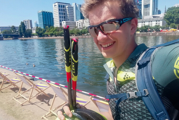 Auf perfekten Radwegen laufe ich durch das idyllische Taubertal mit vielen kleinen Dörfern und Städten am Wegesrand. In einer Stadt nehme ich anstelle einer verpassten Fahrradrampe unfreiwillig die Fußgängertreppe, und jage auf dem Skirollerholm die Treppenstufen hinab. Ich versuche, einen Sturz zu verhindern, als genau in diesem Moment am unteren Ende der Treppe ein Auto quer anschießt und meinen „Abgang“ kreuzt. Vollbremsung. In solchen Momenten bin ich unglaublich froh, dass ich mir extra für die Cross-Rollski eine Bremse an meinen Fischer-Sommerschuh gebaut habe (für alle Nicht-Langläufer und -Rollsportler: Skiroller besitzen standardmäßig keine Bremsen). Hinter dem hügeligen Taubertal erreiche ich auch schon den Main, dem ich über Miltenberg nach Aschaffenburg folge. Inzwischen schmerzen die Schultern aufgrund der Last und der Reibung des Rucksacks beim Armschwung: Der gesamte Bereich zwischen Brust und Schulterbein ist ein einziger brennender, roter Fleck. Ich laufe bis nach Frankfurt am Main, gönne mir am Nachmittag ein paar Stunden Pause und schaue mir nach der Krawallnacht am Opernplatz die Stadt an.