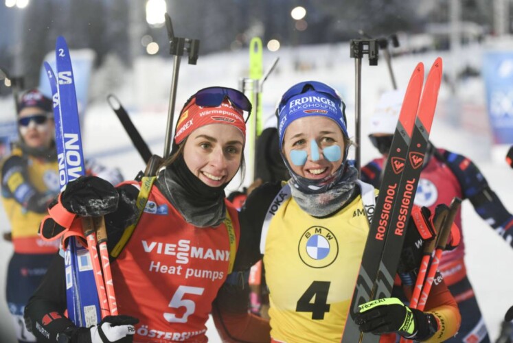 Im Zielsprint setzt sich die Französin Lou Jeanmonnot gegen Franziska Preuß durch und gewinnt nach dem Sprint auch die Verfolgung beim Biathlon Weltcup in Östersund. Vanessa Voigt komplettiert das Podest und sorgt für einen weiteren Doppelerfolg der deutschen Biathletinnen.