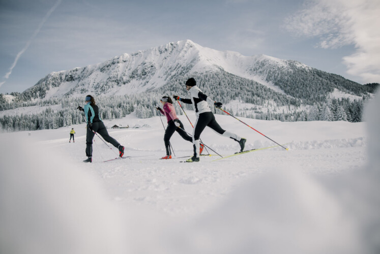 Nach dem Mittagessen fahren wir hinauf zum Passo Lavazè. Hier befindet sich auf circa 1.800 Metern Höhe das schneesicherste Langlaufzentrum der Region Val di Fiemme. Als Ausweichort für die Nordische Ski-WM 2003 angelegt, kann man hier meist bereits Anfang Dezember seine Runden drehen. Ist das gesamte Loipennetz gespurt, sind die Kilometer fast unzählbar und man gelangt sogar ins benachbarte Südtirol. Wir haben uns aber für eine leichte Runde auf der Hochebene des Passes entschieden und laufen die Campiol Loipe in klassischer Technik. Dabei tun sich uns unbeschreibliche Panoramen auf. Vom Latemar über die Bergspitzen Südtirols bis zum Weiß- und Schwarzhorn oberhalb des Jochgrimm werden fast alle Felsen von der tief stehenden Sonne rötlich angestrahlt.