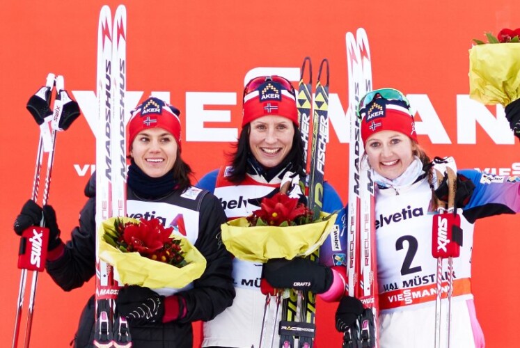 Marit Bjørgen war wieder einmal nicht zu schlagen. Die Norwegerin hielt sich auf der ersten Runde noch gemeinsam im Pulk mit ihren drei Teamkolleginnen auf und übernahm erst danach die Kontrolle. Sie gewann schließlich problemlos vor Heidi Weng, die sich im Zielsprint knapp gegen Ingvild Flugstad Østberg durchsetzte. „Meine körperliche Verfassung ist sehr stark, meine Beine fühlen sich gut an und auch die Jungs im Wachstruck machen eine super Arbeit. Sobald ich die Startnummer trage, werde ich auch Gas geben. Ich werde morgen mein Bestes geben und es nicht ruhig angehen lassen, wenn ich wieder einen guten Ski bekomme“, kündigte die Siegerin an. Rang vier sicherte sich noch Stina Nilsson vor Maiken Caspersen Falla, obwohl die Schwedin gleich nach dem Start den Stock wechseln musste. Laurien van der Graaff musste sich wie in Davos mit Platz sechs begnügen. Schon auf der ersten Runde war die Schweizerin abgeschlagen, durch taktische Spielchen der Norwegerinnen waren Nilsson und die Lokalmatadorin aber wieder heran. Nach einer Tempoverschärfung war es dann aber um die Schweizerin geschehen, vor dem steilen Anstieg strich sie die Segel und lief gemächlich Richtung Ziel. Nach drei Etappen führt Marit Bjørgen nun mit mehr als einer Minute Vorsprung vor Heidi Weng. Die drittplatzierte Therese Johaug liegt schon zwei Minuten zurück, was im Hinblick auf die Alpe Cermis vermutlich zu viel ist.