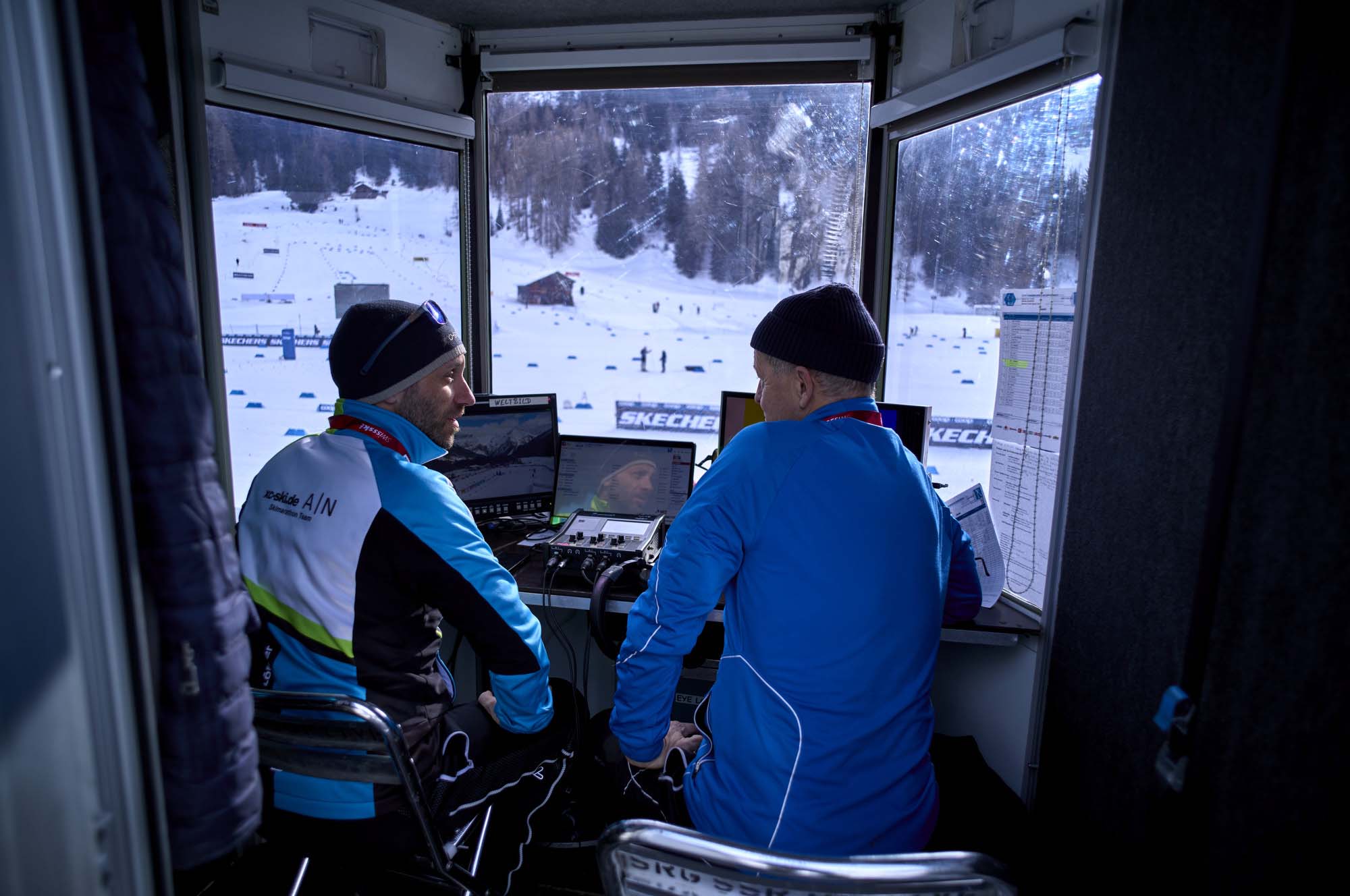 Bildergalerie Blick hinter die Kulissen des Weltcups im Goms ARD-Kommentator Jens-Jörg Rieck mit Langlaufexperte Mario Felgenhauer in der Kommentatorkabine © Marco Felgenhauer / woidlife photography 1 2 3 4 5 6 7 8 9 10 11 12 13 14 15 16 17 18 19 20 21 22 23 24 25 26 27 28 29 30 31 32 33 34 35 36 37 38 39 40 41 42 © Bilder 1 - 42: Marco Felgenhauer / woidlife photography;