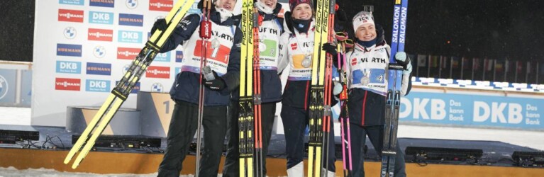 Tarjei Boe (NOR), Johannes Thingnes Boe (NOR), Karoline Offigstad Knotten (NOR), Ingrid Landmark Tandrevold (NOR), (l-r) © Thibaut/NordicFocus