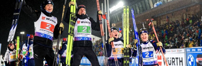 Eric Perrot (FRA), Quentin Fillon Maillet (FRA), Justine Braisaz-Bouchet (FRA), Julia Simon (FRA), (l-r) © Manzoni/NordicFocus