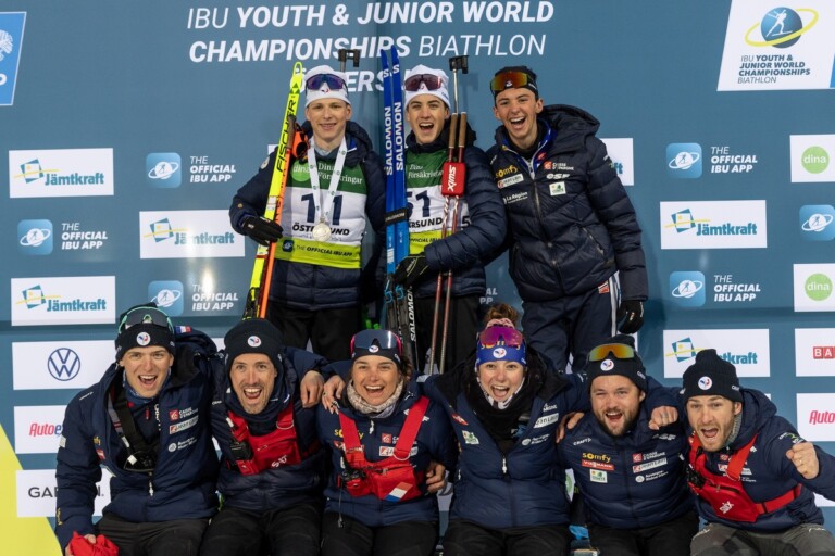 Bildergalerie Jugend und Junioren Weltmeisterschaft Biathlon Oestersund (SWE) Sprint Jugend und Junioren Team France celebrating after medal for Leo Carlier, FRA © Danielsson/IBU 1 2 3 4 5 6 7 8 9 10 11 12 13 14 15 16 17 18 19 20 21 22 23 24 25 26 27 © Bilder 1 - 27: Danielsson/IBU;