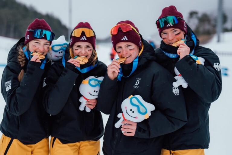 Sarah Hofmann (GER), Jonas Mueller (GER), Lena Einsiedler (GER) und Jakob Moch (GER) feiern den Mixed Titel bei den Olympischen Jugendspielen in Gangwon (KOR) © Team D