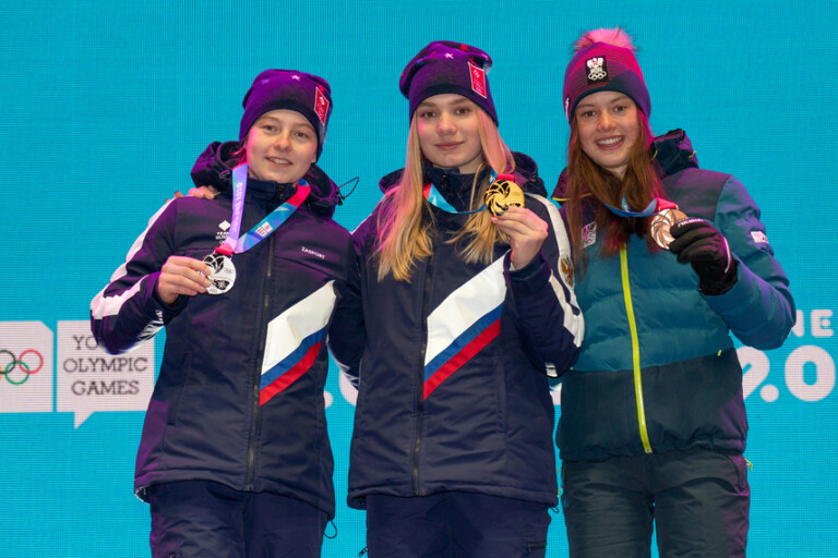 Gold medallist Alena Mokhova RUS (centre), with Anastasiia Zenova RUS (silver medallist, left) and Anna Andexer AUT © OIS/Jed Leicester