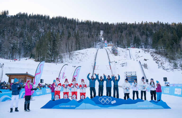 Goldmedaille: Lisa Hirner AUT, Stefan Rettenegger AUT, Julia Muehlbacher AUT, Marco Woergoetter AUT (centre), Silbermedaille Ayane Miyazaki JPN, Yuto Nishikata JPN, Machiko Kubota JPN, Sota Kudo JPN (left), Bronzemedaille Emma Treand FRA, Marco Heinis FRA, Josephine Pagnier FRA, Valentin Foubert FRA © OIS/Joe Toth