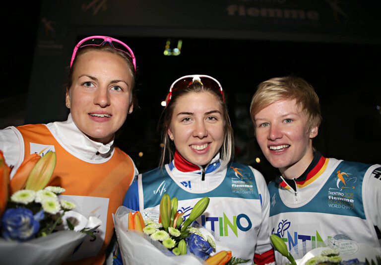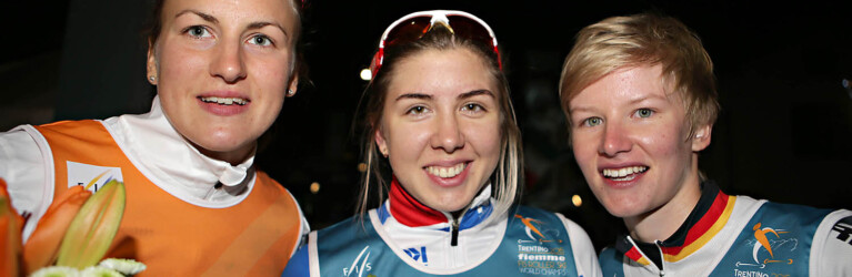 Bildergalerie Rollski WM Val di Fiemme Sprint Freistil Das Podium der Damen: v.l. Linn Soemskar, Ulyana Gavrilova, Kira Claudi © Newspower Canon 1 2 3 4 5 6 © Bilder 1 - 6: Newspower Canon;