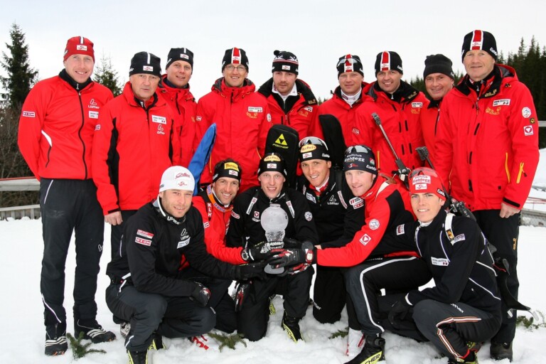 Team Austria with Daniel Mesotitsch (AUT), Fischer, Rottefella, Leki, Christoph Sumann (AUT), Atomic, Leki , Dominik Landertinger (AUT), Fischer, Rottefella, Leki, Friedrich Pinter (AUT), Atomic, Swix, Simon Eder (AUT), Fischer, Rottefella, Tobias Eberhard (AUT), Atomic, Swix © Manzoni/NordicFocus