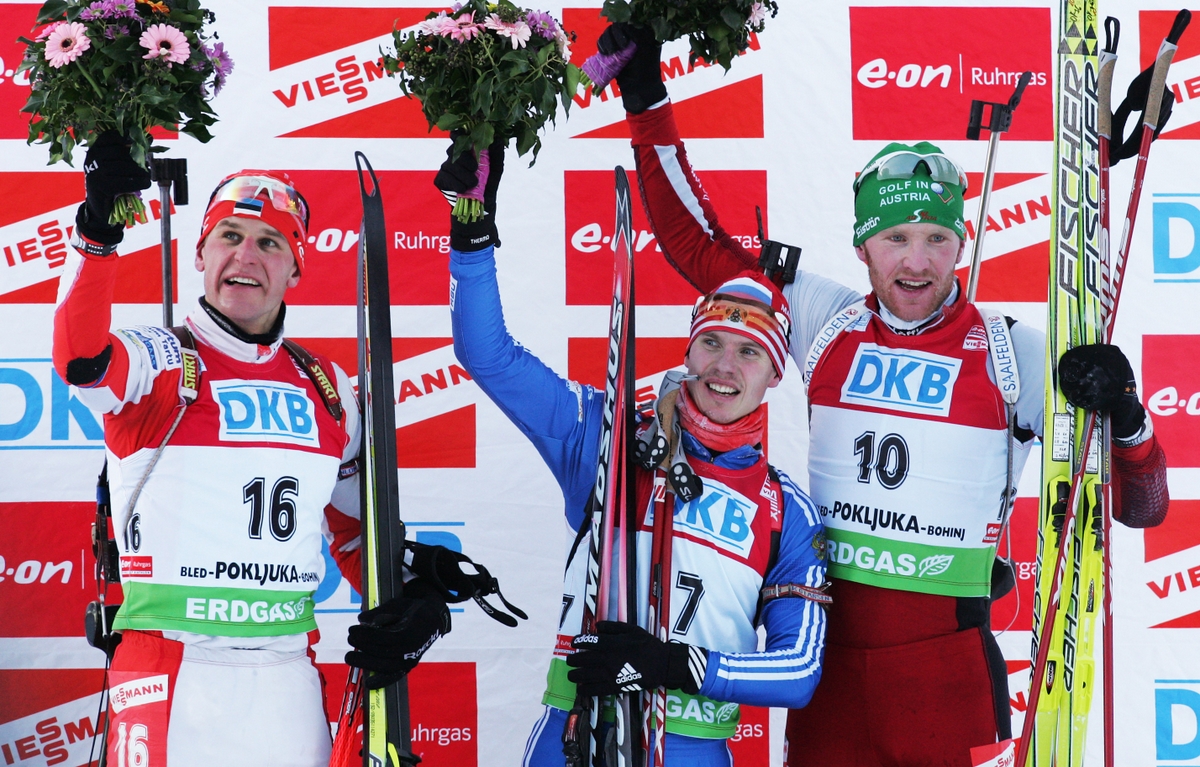 20.12.2009, Pokljuka, Slovenia (SLO): l-r: Roland Lessing (EST), Fischer, Rottefella, Exel, Evgeny Ustyugov (RUS), Madshus, Rottefella, Swix, adidas, Simon Eder (AUT), Fischer, Rottefella, Swix © Domanski/NordicFocus
