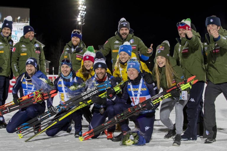 Das italienische Herrenteam freut sich über den 3. Platz - Dominik Windisch (ITA), Daniele Cappellari (ITA), Thomas Bormolini (ITA), Lukas Hofer (ITA) © Nico Manzoni/NordicFocus