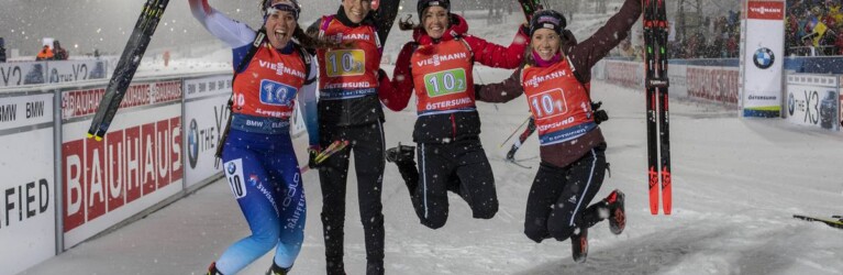 Der erste Podestplatz einer schweizerischen Damenstaffel - 2. Platz in Östersund hinter Norwegen - Lena Haecki (SUI), Aita Gasparin (SUI), Selina Gasparin (SUI), Elisa Gasparin (SUI) © Nico Manzoni/NordicFocus