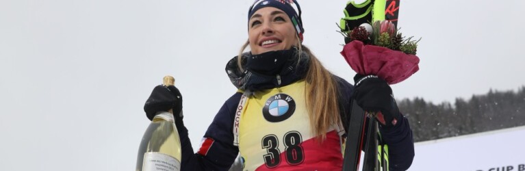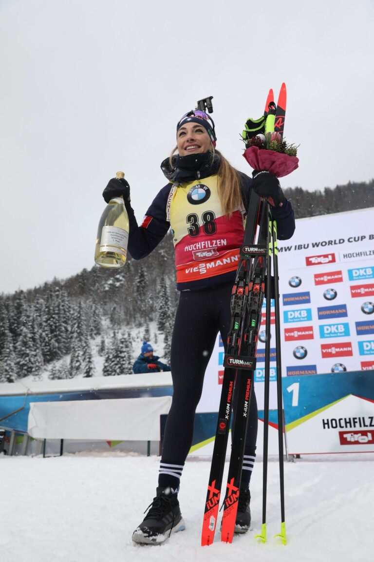 Dorothea Wierer (ITA) gewinnt nach Östersund auch den Sprint in Hochfilzen (AUT) und bleibt im gelb-roten Trikot. © Manzoni/NordicFocus
