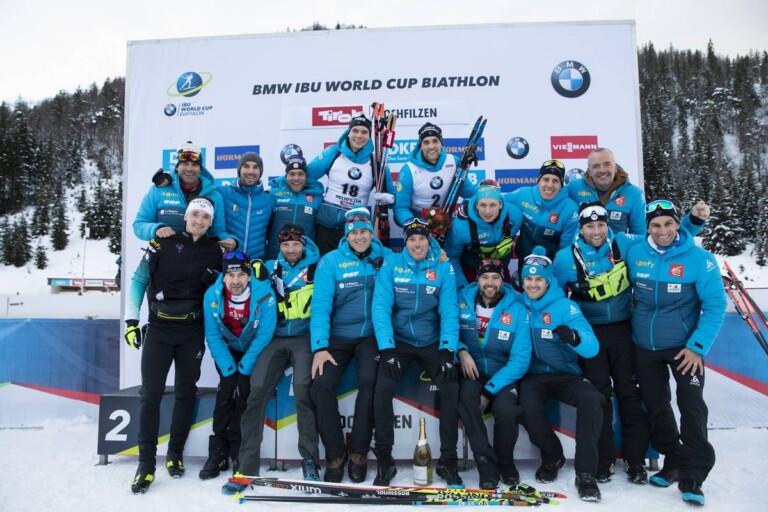 Das französische Herren-Team freut sich über den 3. Rang von Emilien Jacquelin. In der Verfolgung von Hochfilzen stürmte er von Position 18 aus nach vier fehlerfreien Schießen aufs Podest, © Manzoni/NordicFocus