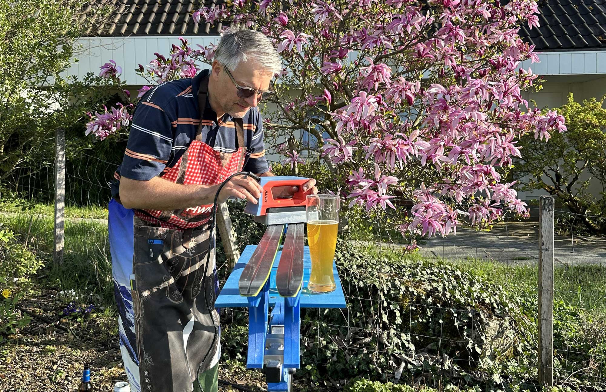Also: Wachstisch aufbauen, Weissbier einschenken (mit Alkohol natürlich!), Musik (eher laut, um Rasenmäher und Hochdruckreiniger zu übertönen! «Time to Say Goodbye» vielleicht?), Ski und Pflegematerial griffbereit legen.