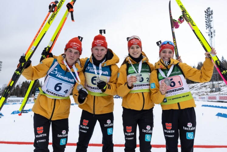 Bei der Jugend- und Juniorenweltmeisterschaft 2025 in Östersund standen nach den Einzelläufen die gemischten Staffeln auf dem Programm. Alma Siegismund, Lotta de Buhr, Fabian Kaskel und Linus Kesper setzten sich bei der Jugend- und Junioren Weltmeisterschaft in Östersund gegen starke Konkurrenten durch und wurden verdient Junioren-Weltmeister. Insgesamt benötigte das Quartett neun Nachlader und mit einem Vorsprung von 16,9 Sekunden führte Linus Kesper seine Staffel zum Sieg. Dahinter herrschte auf der Schlussrunde ein harter Kampf um Silber und Bronze zwischen Österreich und Frankreich. Fabian Müllauer (AUT) verließ den Schießstand nur 0,5 Sekunden vor dem Franzosen Edgar Geny. Dieser hielt sich erst an den Skienden von Müllauer, schob sich erst an Müllauer vorbei, der konterte um später erneut vom Franzosen überholt zu werden. In einer Haarnadelkurve kam Edgar Geny zu Sturz und hier war dann erst wieder der Österreicher vorne, aber Geny gab nicht auf und mit starkem Stockeinsatz kam er wieder in Schwung, ging in der nächsten Abfahrt an Müllauer vorbei und brachte die französische Staffel (Voldiya Galmace Paulin, Amandine Mengin, Gaetan Paturel) nach vier Strafrunden und 13 Nachladern auf dem Silberrang ins Ziel. Wilma Anhaus, Anna Andexer, Thomas Marchl und Fabian Müllauer komplettierten das Podest nach zehn Nachladern auf dem Bronzerang. Norwegen, Ukraine und Bulgarien reihten sich dahinter ein. „Das Rennen war heute echt genial. Ich habe einen super Tag erwischt und bin mit null Fehlern am Schießstand durchgekommen, was für mich einfach richtig cool ist. Läuferisch habe ich mich auch sehr gut gefühlt und habe mich immer mit der Schwedin gematcht. Das wir jetzt die Medaille gewonnen und vom letzten Jahr verteidigen konnten, ist einfach genial,“ so Anna Andexer. „Das war ein richtig cooles Rennen heute. Ich hatte schon ein bisschen Druck, weil Wilma, Anna und Thomas einfach ein richtig gutes Rennen abgeliefert haben, und ich wollte die Medaille unbedingt nach Hause bringen. Liegend habe ich den Nachlader Gott sei Dank gleich getroffen, aber beim Stehendschießen war der letzte Schuss dann schon ein wenig zittrig. Umso schöner ist es jetzt, dass ich getroffen und wir die Medaille gewonnen haben,“ sagte Fabian Müllauer nach dem Rennen. (Quelle: PM ÖSV)