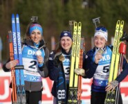 Den dritten Sieg vor Augen stand Justine Braisaz-Bouchet zum letzten Anschlag bereit, räumte ab und zeigte deutliche Emotionen als sie aus dem Schießstand in die Schlussrunde einbog. Nun stand Lisa Vittozzi bereit und auch sie lieferte ab. Lou Jeanmonnot brachte die Null und kam als Drittplatzierte zurück in die Spur, aber nur 17,7 Sekunden später machte sich Julia Simon auf Richtung Ziel. Dahinter lagen eingangs der Schlussrunde Lisa Theresa Hauser, Vanessa Voigt, Franziska Preuß und Anna Gandler und auf der Schlussrunde wurde um jeden Meter und jede Platzierung gekämpft. Justine Braisaz-Bouchet lief unter einer La-Ola-Welle der Betreuer an der Strecke zum dritten Weltmeistertitel, Lisa Vittozzi zu Silber und Lou Jeanmmonot sicherte sich den Bronzerang.