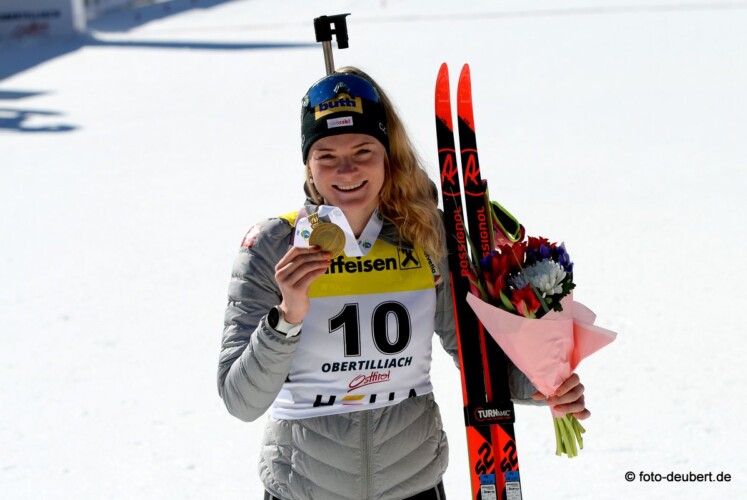 Die Schweizerin Amy Baserga traf am Schießstand alles und setzte im Sprint der Juniorinnen bei der Jugend- und Juniorenweltmeisterschaft früh eine Richtzeit, die von keiner der nachfolgenden Starterinnen mehr unterboten wurde. Die 20jährige gewann Gold und ist Junioren-Weltmeisterin im Sprint. Rebecca Passler (ITA) kam nach einer Strafrunde mit einem Rückstand von 22,2 Sek. auf dem Silberrang ins Ziel und Juni Arnekleiv aus Norwegen komplettierte das Podest auf dem Bronzerang nur 0,7 Sek. dahinter. Die Abstände im Top-10-Bereich waren sehr eng und so verpasste die Französin Camille Bened das Podest auf dem vierten Rang nur um 8,2 Sek. Lea Meier, ebenfalls aus der Schweiz, belegte Rang fünf vor der Russin Anastasiia Goreeva, die nach drei Strafrunden noch auf den sechsten Platz lief. Amy Baserga bewies schon in der vergangenen Saison, dass sie eine der besten Nachwuchsbiathletinnen ist. Sie gewann die IBU Junior-Cup Gesamtwertung und darüber hinaus die kleine Kristallkugel im Einzel und in der Verfolgung. Mit der frühen Startnummer 10 ins Rennen gestartet, musste die Schweizerin im Zielraum lange und geduldig warten, was die nach ihr Gestarteten machen und wurde immer wieder von ihren Tränen gepackt. Nach ihrem vierten Platz im Einzel in Obertilliach lief sie heute im Sprint mit der schnellsten Schlussrunde zum Junioren-Weltmeistertitel und sagte nach dem Rennen: „Das fühlt sich großartig an. Ich möchte diese Medaille meinem Freund widmen.“ Der war im letzten Jahr nach einem Unfall tödlich verunglückt, vierzehn Tage bevor die beiden eine gemeinsame Wohnung beziehen wollten.