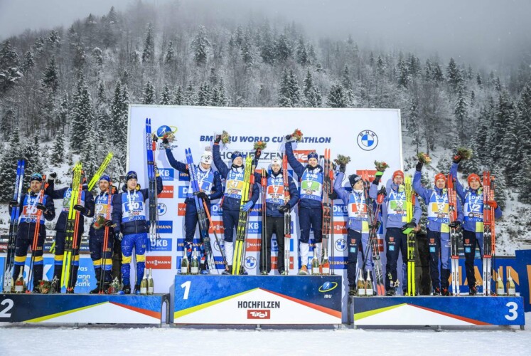 Die norwegische Herrenstaffel mit Sturla Holm Laegreid, Filip Fjeld Andersen, Johannes Thingnes Boe und Schlussläufer Vetle Sjaastad Christiansen gewinnen nach einer Strafrunde und sieben Nachladern mit 20 Sek. Vorsprung vor den Schweden nach Kontiolahti auch den Teambewerb in Hochfilzen. Die Schweden mit Jesper Nelin, Martin Ponsiluoma, Peppe Femling und Sebastian Samuelsson benötigten insgesamt acht Nachlader. Mit einer beherzten Aufholjagd durch die beiden Schwarzwälder Roman Rees und Benedikt Doll bringt dieser die Staffel nach insgesamt einer Strafrunde und fünf Nachladern auf dem Bronzerang ins Ziel. Dahinter platzierten sich Frankreich mit Antonin Guigonnat, Fabien Claude, Emilien Jacquelin und Quentin Fillon Maillet (+ 51,5 Sek., 9 NL) auf dem vierten Rang. Finnland (9 NL) kam mit deutlichem Rückstand auf Platz fünf vor Österreich (David Komatz, Simon Eder, Felix Leitner, Harald Lemmerer, 4 NL) und der Schweiz (Sebastian Stalder, Niklas Hartweg, Joscha Burkhalter, Jermey Finello, 9 NL).