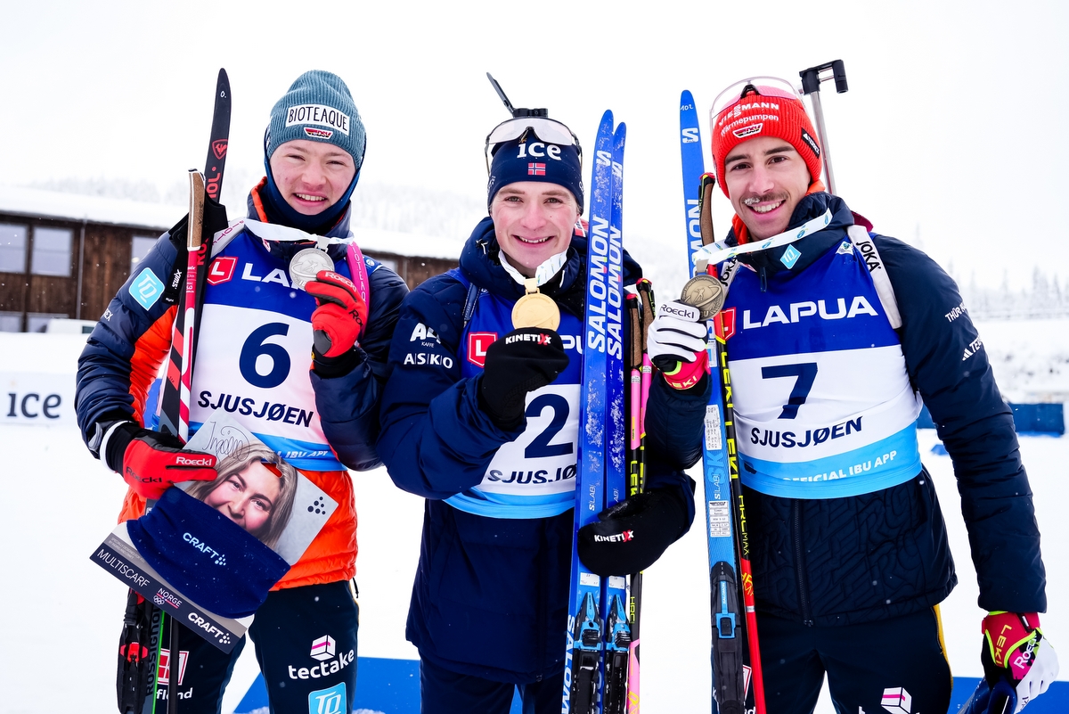 Während der Norweger Frey mit gutem Vorsprung zum entscheidenden Schießen ansetzte und, nachdem der erste und der letzte Schuss nicht ins Ziel kam, in der Strafrunde kreiselte, verballerten seine engsten Verfolger ihre Podestchancen. Paturel verfehlte drei Scheiben, Heikkinen neben ihm auch und nachdem beide ihre Strafrunden absolvierten lag es an den Verfolgern die gebotene Chance zu nutzen. Leonhard Pfund hatte bis dahin erst eine Strafrunde aus dem ersten Anschlag im Gepäck, im zweiten und dritten Schießen blieb er fehlerfrei und eine ebenso fehlerfreie Serie gelang ihm im entscheidenden Schießen. Als Vierter zum Schießen gekommen ließ er Scheibe für Scheibe weiß werden und bog 29,9 Sekunden hinter dem aus der Strafrunde kommenden Isak Frey an zweiter Position in die Schlussrunde. Simon Kaiser, der neben dem Norweger Martin Nevland zum Schießen ansetzte, schaffte eine perfekte Serie und lief nur 0,5 Sekunden vor dem aus der Strafrunde zurückkommenden Nevland in die letzte Runde. Angefeuert vom deutschen Lauftrainer Andi Stitzl kamen die beiden Deutschen sogar noch auf Sichtkontakt zu Frey heran. Der Norweger brachte den Sieg mit 16,9 Sekunden Vorsprung sicher ins Ziel. Nach Silber im Sprint und in der Verfolgung sicherte sich Isak Frey die Goldmedaille in der Verfolgung. „Ich habe zwei Silbermedaillen und ich habe um eine Goldmedaille gekämpft,“ so Isak Frey im IBU-Interview nach dem Rennen, wo er auch berichtete, dass seine Familie und seine Freundin vor Ort seien und ihn angefeuert haben. Leonhard Pfund überquerte die Ziellinie auf dem Silberrang und Simon Kaiser war in der Spur deutlich stärker als der Norweger Nevland, hängte diesen ab und komplettierte das Podest auf dem Bronzerang. Martin Nevland wurde Vierter vor dem Franzosen Gaetan Paturel auf Rang fünf und dem Italiener Didier Bionaz auf Platz sechs.