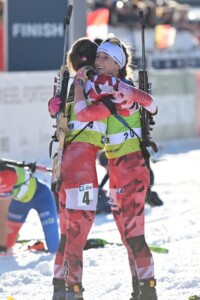 Bei der weiblichen Jugend waren von Anfang an die beiden Österreicherinnen Ilvy Giestheuer (16) und Selina Ganner (17) gut im Rennen und gaben sich auch nach der ein oder anderen Strafrunde nicht auf. Die Französin Adele Ouvrier Buffet kam als Erste zum entscheidenden Schießen, hatte einen Vorsprung von 10,3 Sekunden auf die Slowakin Michaela Strakova. Die Schweizerin Giannina Piller machte sich als Dritte, zehn Sekunden später zum letzten Anschlag bereit. Während die Französin und auch Strakova eine Scheibe verfehlten und kreiselten, räumte Piller ab und verließ mit einem Vorsprung von 11,4 Sekunden den Schießstand. Die Französin Ouvrier Buffet war erste Verfolgerin und dann reihte sich ebenfalls nach einer fehlerfreien Serie die Österreicherin Selina Ganner ein. Ilvy Giestheuer kam mit einem Rückstand von 28,7 Sekunden aus der Strafrunde und auf der Schlussrunde wurde richtig gekämpft. Mit der schnellsten letzten Runde zog Selina Ganner an den beiden Mädels vor ihr vorbei und brachte den Sieg 10,2 Sekunden vor Ouvrier Buffet ins Ziel. Beide hatten insgesamt drei Strafrunden im Gepäck. Auch Giestheuer hatte noch genügend Kraft im Tank um am letzten Anstieg alles zu geben, an die Schweizerin heranzulaufen und schließlich im Schlussspurt mit 0,4 Sekunden Vorsprung sich die Bronzemedaille zu sichern. Bitter für die Schweizerin Piller, die das Podest und ihre erste Medaille auf der Schlussrunde nicht halten konnte und auf dem undankbaren vierten Platz landete. Ganner sagte nach dem Rennen: „Das war heute richtig cool und nach dem zweiten Schießen habe ich nicht gedacht, dass ich das heute noch gewinnen könnte. Jetzt gemeinsam mit Ilvy am Podium zu stehen, ist einfach nur schön.“ Ilvy Giestheuer: Es ist einfach so cool, dass Selina gewinnen konnte und dass wir heute gemeinsam am Podium stehen dürfen. Als ich auf der Zielgeraden den dritten Platz holen konnte, war das ein unglaubliches Gefühl und ich habe im Ziel einfach nur mehr gejubelt.“ (Quelle: Ski Austria PM) Beste von den deutschen Mädels wurde Katharina Staller (3 Fehler) auf dem achten Rang und Ina Lickert (6 Fehler) sortierte sich als 33. ein. Leonie Hinterstoisser startete nicht und Giovanna Nicolussi brach das Rennen ab.