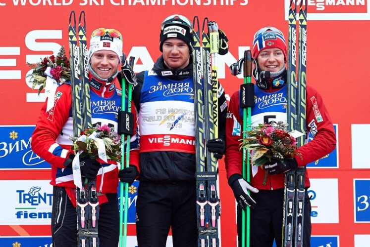 Dario Cologna ist neuer Weltmeister im Skiathlon! Der Schweizer hat sein großes Ziel erreicht und hat sich in einem kuriosen Rennen seinen ersten Weltmeistertitel gesichert. Er hatte als Medaillenkandidat auf den Sprint verzichtet, um sich ganz auf das heutige Rennen zu konzentrieren – und es fing so schlecht an: Nach vier Kilometern wurde Dario Cologna vom Stock eines Gegner ausgebremst, was zu einem Sturz des Schweizers führte, der viele Positionen im dichtgedrängten Feld kostete. Insgesamt wurde aber über mindestens 3/4 des Rennens ein absolutes Bummeltempo angeschlagen, so dass knapp 50 Athleten bis zur ersten leichten Tempoverschärfung zusammenblieben. Auf dem Freistilstück „gelang“ es Martin Johnsrud Sundby, unbeabsichtigt mehrere Kilometer in mäßigem Tempo vorauszulaufen, nachdem Northug und Roethe die Verfolger blockiert hatten. 15 Sekunden Vorsprung störte das Feld nicht, weder das Hauptfeld noch der Führende erhöhten das Tempo, bis sich der Norweger schließlich doch wieder einholen ließ. Schließlich übernahm Dario Cologna auf der Schlussrunde das Kommando, attackierte am Anstieg und überraschte Northug & Co., der heute während des gesamten Rennens nicht frisch wirkte und bei höherem Tempo schon viel früher den Anschluss verloren hätte. Cologna setzte sich zusammen mit Maxim Vylegzhanin und den Norwegern Martin Johnsrud Sundby und Sjur Roethe ab und lief der Goldmedaille entgegen. Petter Northug bemühte sich um Anschluss, konnte aber nur den Russen noch abfangen, so dass Silber und Bronze an seine Teamkollegen Sundby und Roethe gingen. Alexander Legkov kam als Sechster ins Ziel vor den Schweden Calle Halfvarsson und Marcus Hellner.