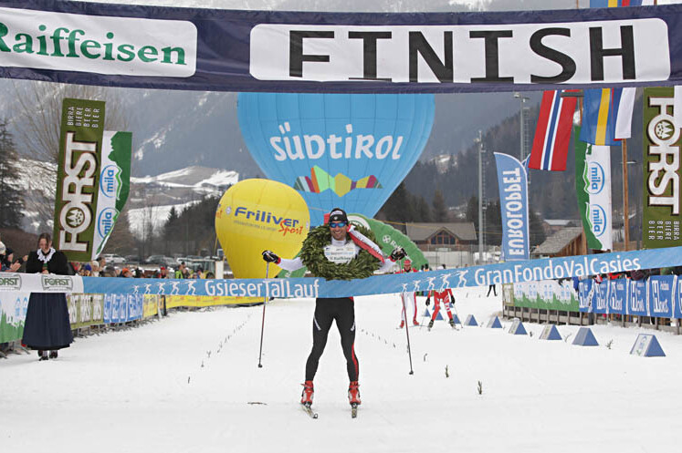 Wolkig war es und nicht allzu kalt, als die Teilnehmer aus 38 Nationen kurz vor dem Ortseingang von St. Martin auf die Strecke gingen. Die Loipe war trotz prekärer Schneelage in optimalem Zustand. Im ersten Teil des Rennens haben rund 50 Athleten für das Tempo gesorgt, darunter auch die Deutschen Thomas und Escher, Di Centa gemeinsam mit Enrico Nizzi, Simone Paredi und Janmatie Kostner sowie der Österreicher Jentsch. Beim Hoku-Zwischensprint holte sich Nizzi die Prämie vor Di Centa und Kostner, aber da war das Rennen noch lange nicht zu Ende. Zu Beginn des Anstiegs nach St. Magdalena setzte sich der erfahrene Di Centa an die Spitze. Bis zum höchsten Punkt der Strecke hatte der zweifache Olympiasieger einen Vorsprung von 53 (!) Sekunden auf das Duo Escher-Kostner herausgelaufen. Bergab ins Ziel nach St. Martin baute Di Centa seine Führung auf 1:12 Minuten aus und beendete das Rennen schließlich nach 42 Kilometern in 1:41.30 als Erster. Im Zielsprint konnte sich Kostner von Escher lösen und so Platz zwei herauslaufen. „Ich habe mein Tempo kontinuierlich erhöht. Das war für mich ein wichtiger Test im Hinblick auf meine letzte WM, die in wenigen Tagen in Falun beginnt“ so Di Centa im Ziel.