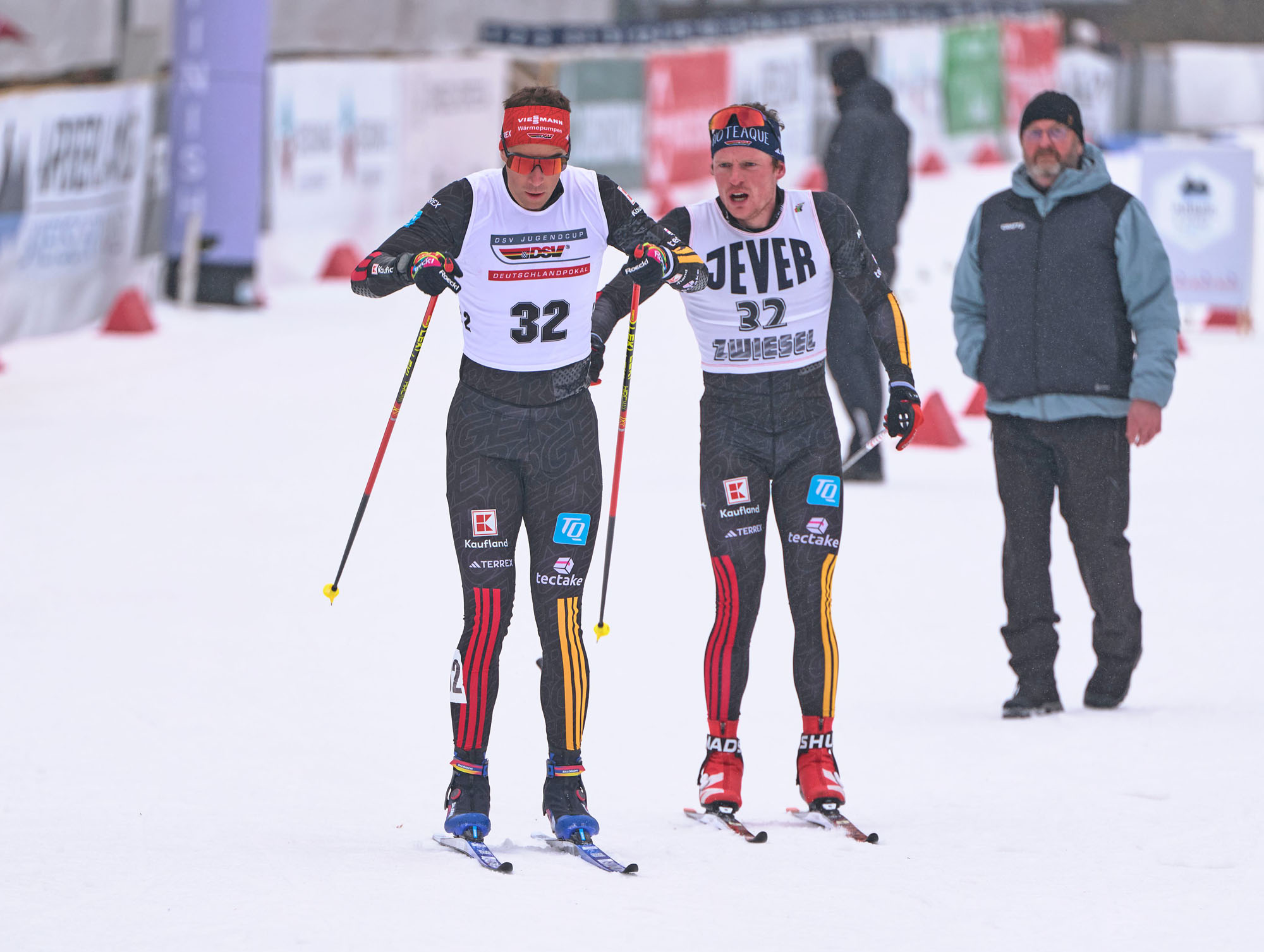 Bei den Herren, die drei Mal fünf Kilometer zu absolvieren hatten, entwickelte sich ein spannender Dreikampf zwischen dem SC Partenkirchen, dem VSC Klingenthal und dem SC Oberstdorf. Zunächst hatte Max Goether den VSC in Führung gebracht, ehe Tilman Hartlieb auf der zweiten Position für Partenkirchen einen Vorsprung herauslaufen konnte. Den verteidigte Korbinian Heiland auf den letzten Kilometern und sicherte den beiden zusammen mit Startläufer Max Olex den Titel. Klingenthal schaffte es knapp dahinter in der Besetzung Goether, Luca Petzold und Janik Weidlich auf Platz zwei vor den Oberstdorfern mit Magnus Zint, Claudius Benkert und Felix Bollwein.