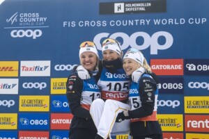 Frida Karlsson zog auch in der letzten Runde einsam ihre Runden und baute den Vorsprung noch weiter aus. Dahinter versuchte Heidi Weng eine Attacke am Svartbekken („Schwarzer Bach“) unweit des Frognerseteren. Zwar konnte sie sich nicht absetzen, sorgte aber dafür, dass Diggins und Sundling erneut den Anschluss verloren. Bei den Damen betrug die Siegerzeit 2:07.48 Stunden und der Vorsprung war mit fast zwei Minuten noch deutlich angewachsen. Auf den letzten Kilometern machte Karoline Grøtting bei den Verfolgerinnen wieder ordentlich Druck, aber an letzten Anstieg waren es Linn Svahn und Jonna Sundling, die links und rechts an der Führenden Heidi Weng an den Verpflegungsposten vorbeizogen. Linn Svahn ersprintete sich Platz zwei vor Sundling, die somit erstmals für einen schwedischen Sweep sorgten. Sundling hatte sich wie auch Diggins immer wieder herangekämpft und war zum Sprint zur Stelle. Heidi Weng musste sich mit dem vierten Platz begnügen vor Karoline Grøtting und Jessie Diggins, die noch Nora Sanness absprintete. „Es ist so ein magischer Tag für unser Team“, sagte Frida Karlsson mit Tränen in den Augen. „Es ist unser erstes Triple im Distanzrennen. Das ist unglaublich. Ich habe mich super mutig gefühlt, aber ich war sehr müde am Schluss. Wir haben gestern verschiedene Taktiken besprochen in der Teambesprechung. Aber es hätte nicht besser enden können.“ Zu dem Experiment mit Damen und Herren gleichzeitig sagte sie: „Das war cool, wir sind manchmal Männern begegnet. Soll ich sie jetzt anfeuern, habe ich überlegt. Ich finde, es war ein tolles Konzept.“ Die Siegehrung wurde noch etwas verschoben, weil Linn Svahn in den Juryraum gerufen wurde. „Das macht dich ein bisschen nervös“, sagte sie später. Zur Jury musste sie in ihrer Rennkarriere noch nie bisher. Der Grund war ein Manöver im letzten Anstieg gegen Karoline Grøtting, was aber von der Jury als Rennvorfall eingestuft wurde. Glück für Svahn, die erst Donnerstag eine gelbe Karte bekam.