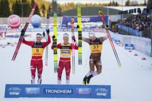 So lief der 100-fache Weltcupsieger auch als Erster in die Wechselzone ein und verließ sie als Führender vor Pellegrino, Jenssen, Nyenget, Anger und Barp, der im Interview vor dem Rennen angekündigt hatte, heute aufs Podium laufen zu wollen. Für einen ging der Skiwechsel aber völlig in die Hose: Der 19-jährige Alvar Myhlback war mit dem Skiwechsel völlig überfordert und wusste nicht, in welcher Box seine Ski lagen. Ein Blick auf die Startnummer half auch nicht so einfach – schließlich trug er das grüne Trikot. Nach einiger Suche fand er sein Material und lief dann auch noch mit falschem Stock los, so dass er noch einmal umdrehte und weitere Zeit verlor. Auch die zweite Rennhälfte wurde erwartungsgemäß von den Norwegern dominiert, die mit neun Athleten in den Top 20 unterwegs waren. Beim Bonussprint in Runde zwei in der freien Technik war ausnahmsweise mal nicht Klæbo vorne sondern Ree vor Nyenget, Vermeulen und Musgrave, nachdem Klæbo in der klassischen Technik noch die meisten Bonuspunkte geholt hatte. Anschließend verschärfte Andrew Musgrave das Tempo vor Mathis Desloges, bis Iver Tildheim Andersen das Kommando übernahm. Insgesamt war es ein Rennen mit viel Abwechslung auf den Führungsposition, in dem viele Läufer ihre Ambitionen klar machen wollten – vor allem die Norweger wegen der schwierigen Olympia-Qualifikation. Mit Beginn der letzten Runde gehörten noch 19 Athleten zur Spitzengruppe, fünf Läufer mussten aber kurz darauf im Anstieg eine Lücke aufgehen lassen. Martin Løwstrøm Nyenget war der nächste, der das Tempo erhöhte vor Klæbo, Amundsen und Stenshagen sowie Krüger und Valnes. Amundsen übernahm im Sprintanstieg die Spitze vor Stenshagen und Klæbo und Amundsen ging dann auch vor Klæbo und Iversen als Erster in die Abfahrt ins Stadion. Noch vor der letzten Kurve ging aber schon Klæbo vorbei und stürmte ungefährdet zu seinem 101. Sieg im Weltcup. Über Klæbo fand DSV-Sportdirektor Peter Schlickenrieder nur lobende Worte: „Den Klæbo kann man definitiv nicht mehr schlagen, der müsste schon krank werden. Der hat nun den Kniff mit dem Höhentraining final raus. Was er letztes Jahr bei der Weltmeisterschaft gezeigt hat, dass er sechs Siege eingeheimst hat von Sprint bis 50 Kilometer, das zeigt schon seine Extraklasse. Er hat alles, was man als Top-Langläufer braucht und mittlerweile auch den Motor dazu, dass er die langen Kanten gewinnen kann. Früher war er eher auf das taktische im Sprint angewiesen, da macht ihm sowieso keiner was vor, jetzt hat er vier Jahre lang sein Höhentraining optimiert. Er ist der kompletteste und am schwersten zu schlagende Athlet im ganzen Zirkus.“