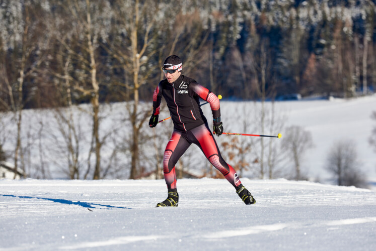 Eine erste Anprobe des Löffler Worldcup Rennanzugs macht das deutlich, was wir schon vorher wussten und es deshalb in unsere Größenwahl haben miteinfließen lassen: Die Bekleidung fällt etwas größer aus. Wer also zwischen zwei Größen schwankt, sollte lieber zur Kleineren greifen beziehungsweise im Handel natürlich vor dem Kauf beide Größen anprobieren. Mit der Löffler-eigenen Unterwäsche Transtex-Light unter dem Anzug geht es dann auch schon nach draußen zum Praxistest. Es hat zweistellige Minusgrade und eines wird schnell klar: Zum Herumstehen ist der Löffler Worldcup nicht gemacht. Das funktioniert nur mit einer extra Wärmebekleidung, ansonsten kommt man schnell ins Frösteln. Ist man allerdings hochaktiv im Training oder Wettkampf unterwegs, dann spielt der Rennanzug seine Stärken aus. Wie bei den Vorgängermodellen genießt man eine hohe Bewegungsfreiheit. Man spürt eigentlich keine Einschränkung bei raumgreifenden beziehungsweise streckenden Bewegungen. So verpufft möglichst wenig Kraft. Beim Schweißtransport harmonieren Transtex Light und das neue Dimple-Elastic Material des Rennanzugs sehr gut. Auf jeden Fall haben wir kein Gefühl von Nässe auf der Haut trotz intensiver Belastung. Dazu tragen sicherlich auch die Netzeinsätze unter den Armen bei, die die Achselhöhlen entlüften. Ob das Dimple-Material auch noch aerodynamische Vorteile (wie beim Golfball) besitzt, konnten wir natürlich in unserem Praxistest nicht nachvollziehen. Plausibel ist es allemal, auch wenn der Vorteil sich wahrscheinlich in einem Bereich abspielt, der unterhalb von Weltcup-Niveau keine Rolle spielt.