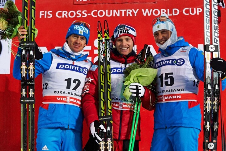 Wie immer bei den Herren war das Rennen zunächst von Taktik geprägt. Nach dem Start war schnell eine 20-köpfige Gruppe zusammen, die sich im Laufe der nächsten Kilometer auf 13 Mann reduzierte. Spannend wurde es dann erst auf der Schlussrunde: Alexander Legkov attackierte am Anstieg, nur Maxim Vylegzhanin und Martin Johnsrud Sundby, der vorher viel Arbeit verrichtet hatte, konnten ihm folgen. Im Zielsprint setzte sich der Norweger gegen die beiden Russen durch und gewann das Ruka Triple. „Es war sehr hart, es ist so kalt hier und dann noch so ein schweres Rennen. 1,5 Kilometer vor dem Ziel ging es los mit Angriffen. Ich musste alles mobilisieren, vor allem im Anstieg. Auf den letzten Metern hatte ich auf den Sieg gehofft, aber dann kam noch Vylegzhanin wieder auf und es wurde noch eng“, meinte Sundby. Auf dem Weg ins Stadion hatten sich mit Maurice Manificat, Sergey Ustiugov und Calle Halfvarsson drei weitere Athleten aus der Gruppe gelöst, die die Plätze vier bis sechs belegten. Marcus Hellner wurde Siebter vor Chris Andre Jespersen, dem sehr stark laufenden Noah Hoffman und Alexander Bessmerthnykh. Lukas Bauer fiel auf den elften Platz ans Ende der Gruppe zurück. Petter Northug musste sich mit 37 Sekunden Rückstand und dem 13. Platz begnügen. Ein ganz starkes Rennen lief dagegen der Österreicher Johannes Dürr, der sich von Startposition 54 auf Platz 18 nach vorn lief.