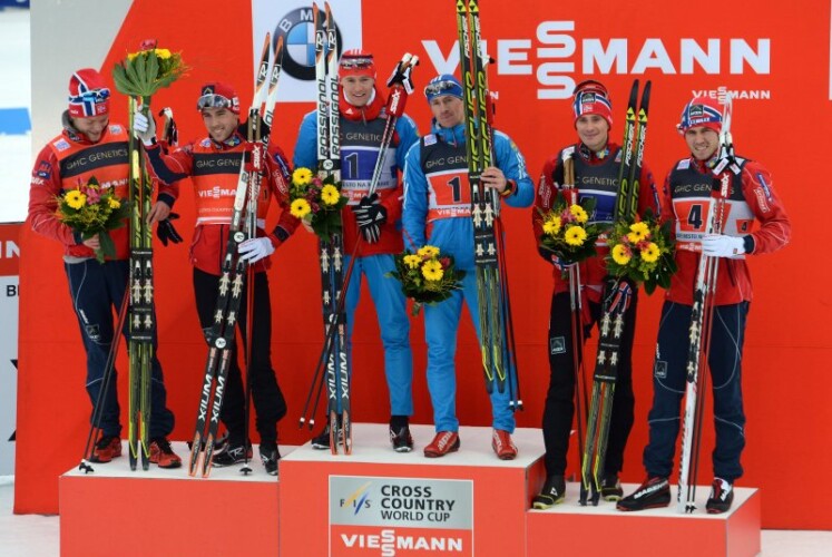 Auch im Teamsprint der Herren, der über eine Distanz von 6×1,6 Kilometer ging, setzte sich ein Trio ab, das den Sieg unter sich ausmachte. Auf der fünften Runde gaben die Startläufer bei ihrem letzten Einsatz alles und die Teams von Norwegen I mit Eldar Rønning und Eirik Brandsdal, Norwegen II mit Pål Golberg und Ola Vigen Hattestad sowie Russland I mit Maxim Vylegzhanin und Nikita Kriukov rissen eine große Lücke zu den übrigen Mannschaften, während Marcus Hellner (im Team mit Emil Jönsson) mit großen Problemen kämpfen musste und das Team aussichtslos zurückwarf. Ueli Schnider, der für die erste Schweizer Staffel eine starke Leistung zeigte, obwohl er im letzten halben Jahr wegen der Beendigung seiner Ausbildung kaum trainieren konnte, bemühte sich als erster Verfolger um Anschluss, konnte diesen aber nicht wieder herstellen. Auf der Schlussrunde belauerten sich die drei Führenden zunächst, der Abstand auf die anderen Mannschaften war mehr als groß genug. Im Zielsprint zog Nikita Kriukov aus dem Windschatten an den beiden Norwegern vorbei und sprintete zum russischen Sieg vor Norwegen I und II. Bei den Verfolgern hatte Josef Wenzl, der gemeinsam mit Sebastian Eisenlauer den Sprung ins Finale geschafft hatte, viel Führungsarbeit zu verrichten, so dass dem Bayern im Zielsprint die Körner fehlten. Eisenlauer/Wenzl belegten den sechsten Rang hinter den Tschechen Jaks/Razym und den Amerikanern Hamilton/Newell. Die Schweizer Ueli Schnider und Gianluca Cologna wurden gute Siebte.