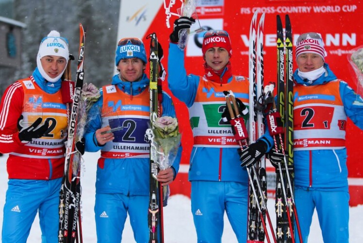 Norwegen gegen Russland hieß das Duell in der Herrenstaffel in Lillehammer. Gleich zu Beginn geriet Samstagssieger Pål Golberg, Startläufer von Norwegen I, ins Straucheln und konnte nur knapp einen Sturz vermeiden. Er verlor den Anschluss und benötigte mehrere Kilometer, um den Anschluss wiederherzustellen. Bis zum ersten Wechsel passierte nicht viel: Zehn Mannschaften lagen innerhalb von zwölf Sekunden, nach dem zweiten Wechsel lagen sogar elf Teams innerhalb weniger Sekunden. Nach etwa 20 Kilometer gelang es den drei Favoritenteams mit ihren Läufern Martin Johnsrud Sundby, Sjur Røthe und Alexander Legkov, eine Lücke zu reißen, die bis zum letzten Wechsel auf 35 Sekunden anwuchs. Durch altbekanntes Bummeln durch Petter Northug und Maxim Vylegzhanin – nur Finn Hågen Krogh (Norwegen II) bemühte sich um Tempo – konnte bald Norwegen III mit Tord Asle Gjerdalen wieder aufschließen, doch als das Tempo auf dem letzten Kilometer erhöht wurde, hatte der Norweger nichts mehr zu melden. Maxim Vylegzhanin zog schon einige hundert Meter vor dem Ziel den langen Sprint an, dem Krogh und Northug nicht folgen konnten. Rang fünf hinter Norwegen III ging an die Schweden, die durch ihren dritten Läufer Calle Halfvarsson den Anschluss verloren, knapp vor Frankreich.
