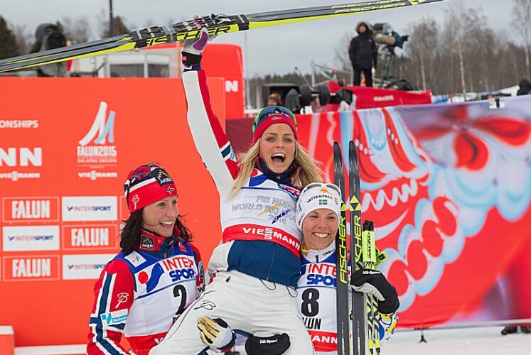 Therese Johaug hat im 30 Kilometer-Rennen in Falun in der klassischen Technik fast einen Start-Ziel-Sieg hingelegt und ihren WM-Titel von 2011 in Oslo im klassischen Stil verteidigt. Silber ging an die Freistil-Weltmeisterin von 2013, Marit Bjørgen, gefolgt von Charlotte Kalla.