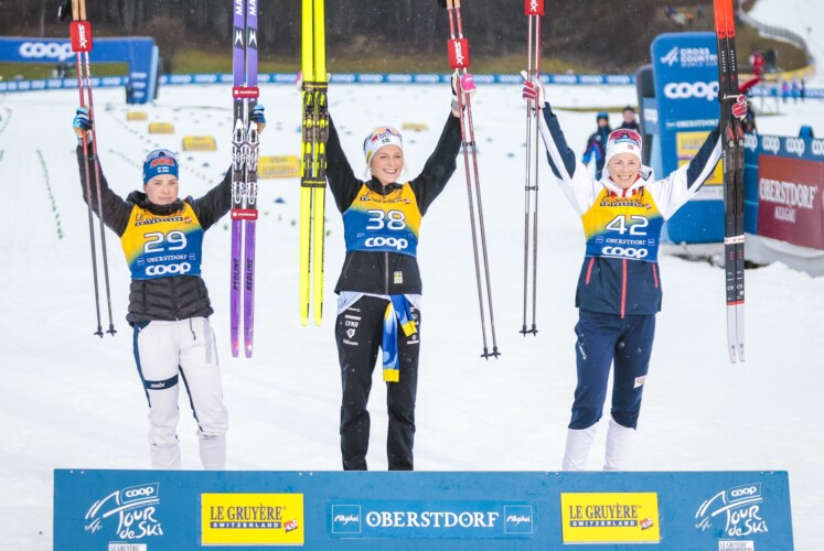 Katharina Hennig und die Österreicherin Teresa Stadlober zeigten ein sehr gutes Rennen und belegten die Ränge sechs und sieben nur knapp hinter Niskanen. „Der Start in die Tour de Ski war deutlich besser, als ich gedacht hätte. Das ist das erste Mal in meinem Leben, dass ich aus einer ruhigen Phase mit wenig Training so in eine Wettkampfphase starte. Da freue ich mich drüber und bin sehr zufrieden, wie es bisher gelaufen ist. Über das heutige Ergebnis freue ich mich auch, weil ich mich nicht super frisch gefühlt habe. Da ist ein sechster Platz mehr als gut, zusammen mit Niskanen auf einer Zeit. Ich denke, das ist eine gute Ausgangsposition für morgen, wo meine schwächere Technik wartet und dann gucken wir, was drin ist“, sagte Katharina Hennig, die sehr viel Unterstützung vor Ort hat: „Meine Großeltern, meine Eltern, meine Geschwister sind da, die Nachbarn von zu Hause. Ziemlich viele sind da und nach Val di Fiemme kommen noch mehr, Tanten, Onkels… Es ist richtig schön, das Zuschauer wieder erlaubt sind. Heute waren auch viele da, haben angefeuert und es war richtig laut, wenn man vorbeigelaufen ist. Das hat auf jeden Fall motiviert.“ In der Gesamtwertung liegt die Deutsche an fünfter Stelle mit 1:23 Minuten Rückstand, Stadlober ist Elfte mit 2:09 Minuten. „Oberstdorf liegt mir normalerweise immer sehr gut und auch das Rennen heute war mit Platz sieben wieder richtig cool“, freute sich die Salzburgerin: „Ich habe in der ersten Runde zwar ein wenig Zeit verloren, aber die zweite Rennhälfte war wirklich sehr gut. In der Gesamtwertung liege ich jetzt auf Rang elf und konnte damit einige Plätze gutmachen. Ich bin heute voll zufrieden, hatte super Material und morgen steht dann mit einer Verfolgung über 20 km schon das nächste harte Rennen auf dem Programm. Jetzt werde ich mich gut erholen und dann morgen wieder voll angreifen.“ Silje Theodorsen belegte Rang acht vor der Slowenin Eva Urevc, die einige Kilometer mit Anne Kjersti Kalvå mitlaufen konnte, die sich auf ihrer letzten Runde allein aber sichtlich am Limit war und immer wieder aus der Balance kam. Heidi Weng machte als Zehnte ein unzufriedenes Gesicht und weist in der Gesamtwertung nun auch schon einen Rückstand von zwei Minuten auf.