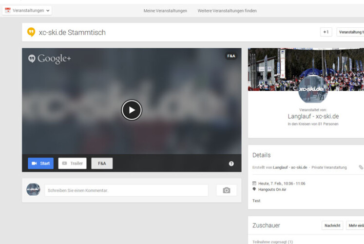 Das Stammtisch-Gespräch wird über Google Hangout on Air stattfinden. Wer einfach nur zusehen will, kann dies einfach hier auf xc-ski.de tun. Wir werden jedes Stammtisch-Gespräch frühzeitig ankündigen. Wer dagegen aktiv teilnehmen will, muss sich bei Google einloggen. Dazu werden wir jede Veranstaltung nach Möglichkeit bereits einen Tag vor Beginn auf unserer Google+ Seite ankündigen (plus.google.com/+Xc-skiDe). Um darauf zugreifen zu können, müsst ihr euch einfach mit eurem Google+ Konto einloggen oder euch einen Account anlegen (das ist hier möglich: plus.google.com). Wenn ihr dann „Langlauf – xc-ski.de“, also unsere Google+ Seite, in eure Kreise aufnehmt, werdet ihr automatisch benachrichtigt, wenn ein neuer xc-ski.de Stammtisch auf dem Programm steht. Dann einfach Teilnehmen und Fragen stellen (das ist auch ohne Webcam über eine Chat-Funktion möglich).