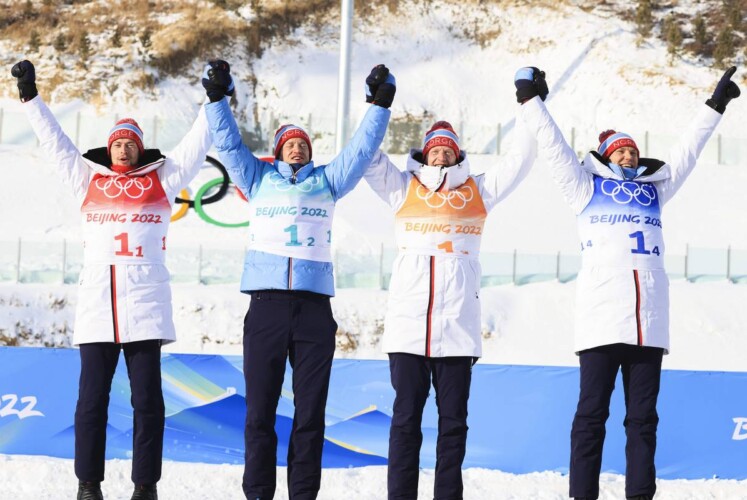 Das norwegische Quartett mit Sturla Holm Laegreid, Tarjei Boe, Johannes Thingnes Boe und Vetle Sjaastad Christiansen wurde in derselben Konstellation vergangenes Jahr Weltmeister auf der Pokljuka. Mit einer Strafrunde und sieben Nachladern wurden sie Olympiasieger in Peking mit 27,4 Sek. Vorsprung vor den Franzosen Fabien Claude, Emilien Jacquelin, Simon Desthieux und Quentin Fillon-Maillet. Im entscheidenden Schießen hatte der Schlussläufer Fillon-Maillet die besseren Nerven und sicherte seinem Team nach neun Nachladern und als eines von nur drei Teams, das ohne Strafrunde auskam, die Silbermedaille. Said Karimulla Khalili, Alexandr Loginov, Maxim Tsvetkov und Eduard Latypov lagen bei jedem Wechsel an der Spitze und mussten sich am Ende nach sechs Nachladern und zwei Strafrunden von Latypov mit Bronze zufrieden geben. Erik Lesser, Roman Rees, Benedikt Doll und Philipp Nawrath waren mit perfektem Material ausgestattet und verpassten nach neun Nachladern und einer Strafrunde die ersehnte Medaille denkbar knapp. Mit deutlichem Rückstand platzierten sich dahinter die Schweden Peppe Femling, Jesper Nelin, Martin Ponsiluoma und Sebastian Samuelsson als Fünfte vor dem Team aus Kanada mit Adam Runnalls, Christian Gow, Jules Burnotte und Scott Gow.