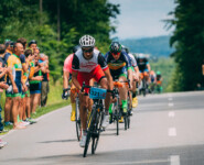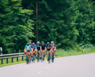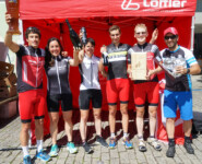 Pünktlich um 14 Uhr knallten dann die Böllerschützen das Signal und die Meute aus über 200 Teams und 200 Einzelfahrern hetzte los. Gleich am ersten Berg versuchten zwei, drei Teams einen Ausreißversuch. Die kleine Lücke konnte Daniel jedoch schnell schließen und auch andere Teams rollten wieder heran. Am höchsten Punkt des zweiten Anstiegs wartete die einzige Sprintwertung des Rennens. Vor dem Start hatte unser Jüngster noch bekräftigt, er sei kein Sprinter. Im Stil eines Peter Sagan holte er sich schließlich trotzdem souverän den Sieg in dieser ersten Wertung. Das hohe Anfangstempo hatte zudem dafür gesorgt, dass die Spitzengruppe nur noch aus neun Teams bestand, unter denen wir das einzige Mixed-Team waren. Und so ging es in hohem Tempo weiter zum ersten Wechsel. Nun hieß es, so lang wie möglich mit der Spitzengruppe mitzufahren, um einen möglichst großen Vorsprung auf unsere Konkurrenten der Mixed-Kategorie herauszuholen. Allerdings mussten innerhalb der ersten 15 Runden alle fünf Teammitglieder je drei Runden absolvieren. Das ist unserer Meinung nach auch sinnvoll und richtig, um den Charakter dieser Wertung nicht dadurch zu verwässern, dass nur die Herren im Team fahren. Deshalb schickten wir dann auch Silvia nach Florian, Thomas und Daniel auf die fünfte Runde. Gerade einmal 100 Meter vor dem höchsten Punkt der Strecke verlor sie den Anschluss an die Spitze, mit der sie sonst sicherlich gemeinsam zum Wechsel gekommen wäre. Da wurde uns erst so richtig bewusst, wie stark unsere Schweizerin im Team tatsächlich ist. Mit etwas Bedenken, ob sie denn die Erwartungen ihrer Teamkollegen erfüllen könne, ging schließlich Sigrun auf ihre erste Runde. Unsere Skimarathonspezialistin und Triathlon-Neueinsteigerin löste ihre Aufgabe jedoch bravourös und hielt uns weiter mit deutlichem Vorsprung auf Platz eins.