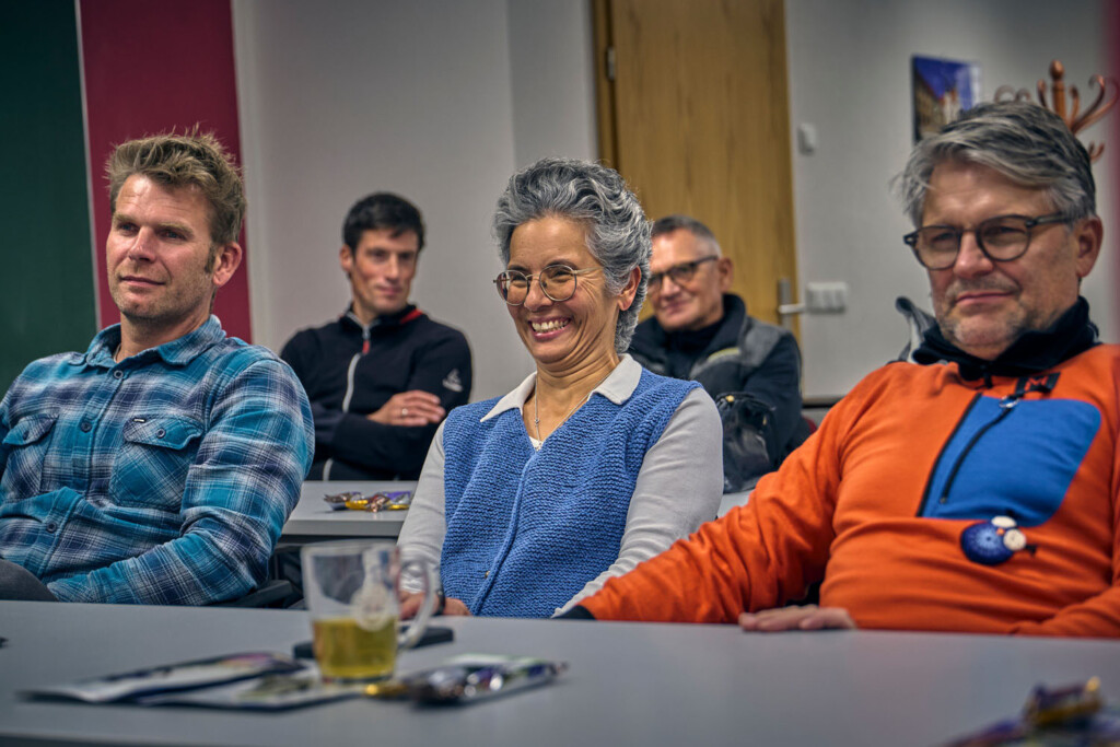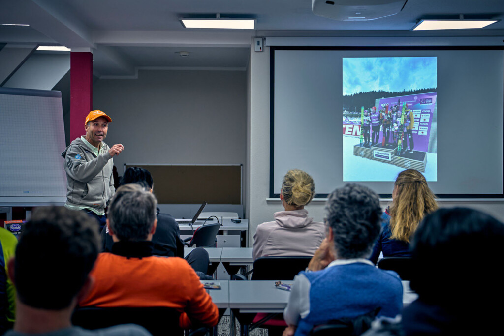 Nach dem Nachtessen treffen wir Peter Schlickenrieder. Es braucht ein wenig, bis alle da sind. Eine Person muss zu spät kommen und eine Person kommt zu spät. Peter Schlickenrieder begrüßt die Person herzlich, greift in seine Hosentasche und zieht einen kleinen Schlüsselanhänger heraus, an dem ein kleiner Plastikfrosch baumelt. «Kriegt bei uns immer die Person, die zu spät kommt.» grinst Peter und geht mit einem Augenzwinkern zurück nach vorne. Spätestens jetzt ist klar, dass an diesem Camp Disziplin und Pünktlichkeit nicht verhandelbar sind (tatsächlich nehmen wir es aber dann doch etwas gelassener). Peter Schlickenrieder gibt Einblicke in die Welt der Teams, des Trainings, der physischen und mentalen Trainingsarbeit und den bevorstehenden Olympia-Winter. Anschließend: individuelle Bettruhe, weil morgen früh Frühsport, Frühstück und Skihalle auf dem Programm stehen.