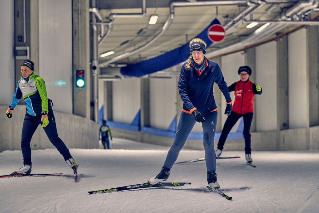 Nach Frühsport (aktiv vollzogen von einigen, alle anderen visualisierten es im Bett) und Frühstück (aktiv vollzogen von allen, niemand visualisierte es im Bett) geht es zur Skihalle. Endlich. Rein in die Schuhe und rein in die Halle. Minus 4 Grad sind ungewohnt. Obwohl das Wetter vor der Halle unverändert ist: nass, kalt und ganz viel Nebel. Konstanten im Leben reduzieren Komplexität. Ski anschnallen und das erste Gleiten im Schnee genießen. Und merken: der Körper kann sich noch erinnern, das Muskelgedächtnis ist noch da! Um uns herum noch viele andere Körper, die sich noch an ganz viel mehr erinnern: Top-Athleten im Vollgas-Modus. Sehr eindrucksvoll. Eine Gruppe von uns macht Technik-Training, eine andere läuft frei; nach einer Stunde tauschen. Skating- und Klassik-Training auf Schnee im September. Nur möglich dank Jubiläums-Camp. Wunderbar. Nach zwei Stunden fällt die Tür von hinten ins Schloss. Ein Höhepunkt ist schon Erinnerung. Zurück ins Hotel und dann zu Sport Luck zum Mittagessen.