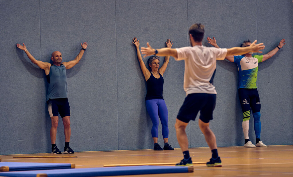 Nachmittags geht es auf die Rollski-Bahn zum Technik- und Lauftraining. Nach dem Warmlaufen folgen Technikübungen in klassischem Stil und im Skating. Ich widme mich dem Diagonalschritt. Nach einer Übungsrunde sagt Thomas: «Und, hast Du schon abgehoben?» Ich bin verwirrt, weil ich eigentlich der Meinung bin, dass ich grundsätzlich mit beiden Beinen auf dem Boden stehe und halbwegs geerdet durchs Leben marschiere. Hat «Lebe Deinen Baum» doch unmerklich einen Schwebezustand ausgelöst? Jäh holt mich Thomas ins Hier und Jetzt zurück: «Versuche, das hintere Bein ausschwingen zu lassen und dabei anzuheben.» Okay, damit kann man jetzt mal arbeiten. Nächste Runde. Die Einheit endet und die Dusche wartet. Abendessen. Schlafen. Großes Finale mit Bergrollern wartet.