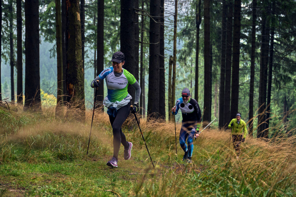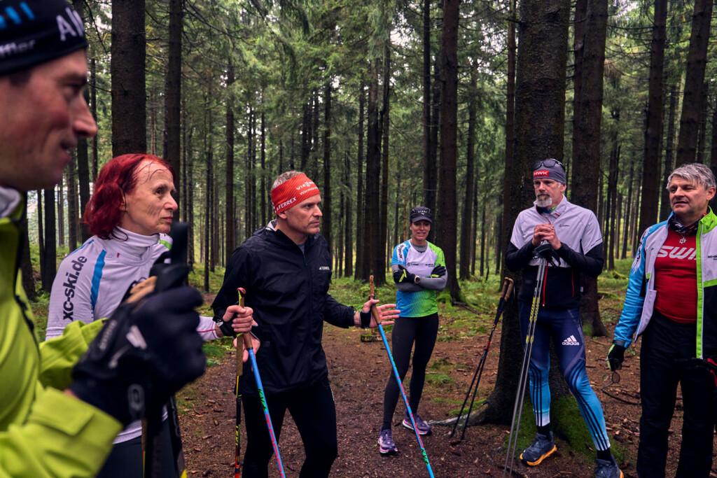 Am Parkplatz riecht es morgens um 9:00 Uhr schon nach Thüringer Rostbratwurst. Das olfaktorische und gustatorische kommt später. Jetzt erst mal Kinästhetik, also Bewegung. Wir treffen Tobias Angerer. Zuerst wird «Du» oder «Sie» geklärt. «Wir sind alle eine große Familie!» sagt Tobias. Damit ist auch klar, wie wir miteinander umgehen. Wir wärmen uns auf, Tobias sucht im Wald die Wege für das Stocklaufen. Dann geht die Trainingseinheit los: Tobias erklärt, Thomas demonstriert. Es wird von mehreren Gängen gesprochen. Die Gedanken gehen nur kurz zurück zur Thüringer Rostbratwurst mit Vorspeise und Dessert. Kinästhetisch geht es aber um mindestens drei Gänge beim Stocklaufen: Skigang, Elchschritte und Stocksprünge. Anstrengend in aufsteigender Reihenfolge. Wir üben im Gelände, Tobias gibt Hilfestellungen. Irgendwann läuft jeder für sich durch den Wald. Man müsse so über dem Standbein stehen, als wolle man auf den Ski kotzen, hat einmal jemand gesagt, sagt Tobias. Das Bild hilft. Rein technisch natürlich. Es werden einbeinige Kniebeugen auf Wurzeln gemacht. Das A&O ist die Balance. Wo wir können, spielen wir mit dem Wald in Bewegung. Würde eine unbeteiligte Person (außerhalb der großen Familie natürlich) das Gewusel betrachten, so würde es wohl aussehen wie «So-wo-samma?»-Suchende oder Seminarteilnehmende von «Feel the Nature. Find Your Self.». Oder so.