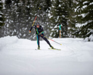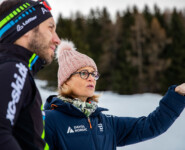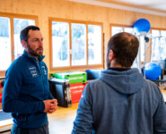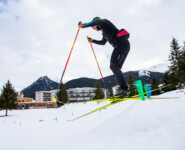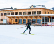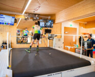 Nur wenige Schritte vom Waldhuus entfernt steht das 2016 neu erbaute Langlaufzentrum Dario Cologna. Hier kann man sich duschen, umziehen und im Bistro mit einer Suppe oder anderen Köstlichkeiten stärken. Und während man hier seine Energiespeicher wieder auftankt, schweift der Blick durch die großen Panoramafenster hinaus über das Übungsgelände und den Loipeneinstieg vor dem Gebäude. Im Obergeschoss hat sich unterdessen der Schweizer Skiverband eingemietet. Hier stehen mehrere Fitness-, Kraft- und Stabi-Geräte, sowie zwei Rollerlaufbänder. Chef des Stützpunktes ist Christian „Hitsch“ Flury. Er zeigt mir, was man hier auf eher begrenztem Raum geschaffen hat. Besonders angetan bin ich vom Laufband. Hitsch zeigt mir, wie man hier vor der WM 2019 die Sprintstrecke von Seefeld simuliert hat. Dann darf ich mich selbst einmal auf diesem ungewohnten Terrain versuchen. Es braucht schon etwas Gewöhnungszeit, bis ich mich bei normaler Geschwindigkeit bewegen kann. Deshalb ist das Training oder ein Leistungstest auf dem Band auch nicht für Hobbysportler zu empfehlen. Die Spitzensportler sind dagegen voll des Lobes über die perfekten Trainingsbedingungen im Langlaufzentrum.