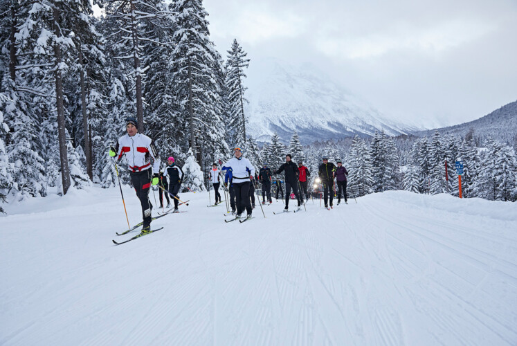 Ein absolutes Highlight wartete am Freitag auf die Teilnehmer. Gemeinsam ging es am Vormittag mit dem Skibus vom Sporthotel Xander zum WM Stadion nach Seefeld, dem Austragungsort der kommenden nordischen Ski-WM. Ein bisschen WM-Luft konnte beim gemeinsamen Aufwärmen im Stadionbereich geschnuppert werden, umrahmt von trainierenden Biathleten am Schießstand auf der einen, und Skispringern auf den Toni Seelos Sprungschanzen auf der anderen Seite. Im Anschluss ging es für die einzelnen Gruppen auf die WM-Loipen auf denen schon in wenigen Wochen die Superstars um Gold, Silber und Bronze kämpfen werden. Während die Genussläufer an ihrer Lauftechnik feilten, um möglichst leicht über den Schnee zu schweben, ging es für die sportlich ambitionierteren Gruppen im Anschluss mit den Ski zurück ins Leutaschtal. Für den ein oder anderen inklusive der Erkenntnis, dass die Strecken des Kaiser Maximilian Laufs, der schon in einer Woche stattfindet, es ganz schön in sich haben.