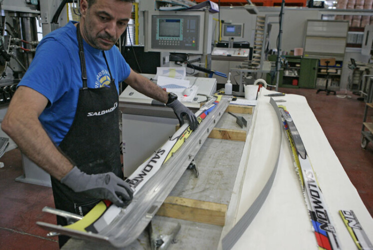 Aber nun führt uns die kleine Besichtigungstour in eine große Produktionshalle. Auch hier sind durch Trennwende einzelne Bereiche abgeteilt. Ich darf zunächst einen Blick in die Testlabors werfen. Dort gibt es unterschiedliche Maschinen, die die Produkte auf Haltbarkeit und Langlebigkeit testen. In der Kältekammer werden gerade bei Minus 20 Grad Salomon Equipe Bindungen in die Mangel genommen. So müssen die Gummiflexoren der Bindungen unzählige Stauchungen aushalten. Eine Station weiter hat eine Testmaschine Snowboardschrott produziert. Die Durchbiegung wurde bis zum Bruch des Boards getestet. Auch Langlaufski landen regelmäßig hier. Auf einer speziellen Messvorrichtung mit unzähligen Sensoren kann die Druckverteilung unter einem Ski genau bestimmt werden. Zusammen mit Praxistests arbeiten die Salomon-Mitarbeiter so an der optimalen Wachsfuge oder dem besten Spannungsverhältnis bei Skating-Ski. Schließlich geht es aber weiter ins Herzstück der Halle, der Skiproduktion. Hier kann man den Produktionszyklus eines Rennskis nachverfolgen. Von der Nomexplatte, die am Ende den Kern des Skis bilden wird, über die Vorstufe mit hölzernen Seitenwangen bis zum „Backautomaten“ vor dem die einzelnen Lagen des Skis aufeinandergelegt und am Ende in einer Form mit 20 bis 110 Kilogramm Druck und einer Temperatur von 130 Grad „verschmolzen“ werden. Welche Spannung der Ski haben wird, bestimmt eine Anordnung von elektronisch gesteuerten Keilen unter der „Backform“. So lassen sich Ski für unterschiedliche Bedingungen und Gewichtsklassen herstellen. Nach dem Abkühlen werden die überstehenden Kanten entfernt und jeder Ski genau vermessen. Die Ergebnisse landen dann mittels eines Aufklebers auf dem Ski und sind für jedermann einzusehen. Damit ist der Ski fertig. Bis ein solcher Prototyp dann reif für die Massenproduktion ist, kann es aber schon mal drei bis vier Jahre dauern. Mindestens in zwei Wintern wird er auf Schnee getestet, bevor jedermann damit in die Loipe gehen kann.
