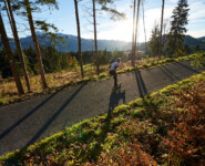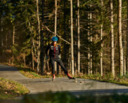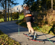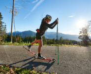 Am späten Nachmittag stand Techniktraining auf Skirollern auf dem Programm. Das Sommertrainingsmittel der Langläufer ist in der schneefreien Zeit die beste Alternative zum Laufen mit Langlaufski. Und in Ramsau am Dachstein hat man auch dafür ein ideales Trainingsgelände. Die Rollerbahn mit Schießstand für die Biathleten ist nur für das Skirollertraining reserviert. Anfängern und Hobbyläufern bietet sie eine 1,8 Kilometer Schleife mit moderatem Profil. Für die Profis stehen Runden mit bis zu 5,6 Kilometern Länge, sowie steilen Anstiegen und Abfahrten zur Verfügung. Sigrun hatte sich für Klassik-Training entschieden, um auf Rollern ihre Lauftechnik zu verbessern. In kleiner Gruppe und unter Anleitung gelang das perfekt und jeder Teilnehmer machte sich mit neuen Erkenntnissen auf den Rückweg zum Hotel. Kurt hatte es dagegen etwas ruhiger angehen lassen und in Hotelnähe mit einer anderen Gruppe Kraftübungen mit Gummiseilen absolviert.