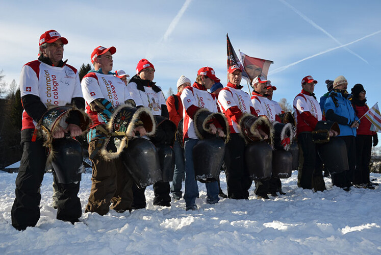 Zwölf von ihnen zieht es dann dennoch in Richtung Start/Ziel und Tribüne. Es ist die sogenannte Treichelgruppe, die mit ihren überdimensionierten Kuhglocken (Treicheln) für Aufmerksamkeit sorgen. Es kommt fast einer Prozession gleich, wenn diese elf Männer und eine Frau mit ihren 15 Kilogramm schweren „Geräuschmachern“ in den Langlaufstadien Mitteleuropas einziehen. Sofort weiß jeder, welche Nation hier besonders unterstützt wird. Aber die Cologna Fans sind faire Sportsmänner. Sie legen Wert darauf, jeden Langläufer anzufeuern, nicht nur den Rekord-Toursieger. Dann zieht es auch die Treichler hinaus auf die Strecke, schließlich ist es nicht mehr lang bis zum Start. Am ersten langen Anstieg oberhalb des Stadions haben andere Mitglieder des Fanclubs bereits Transparente mit dem Konterfei ihres Idols angebracht und sich in Anfeuerungsposition begeben.